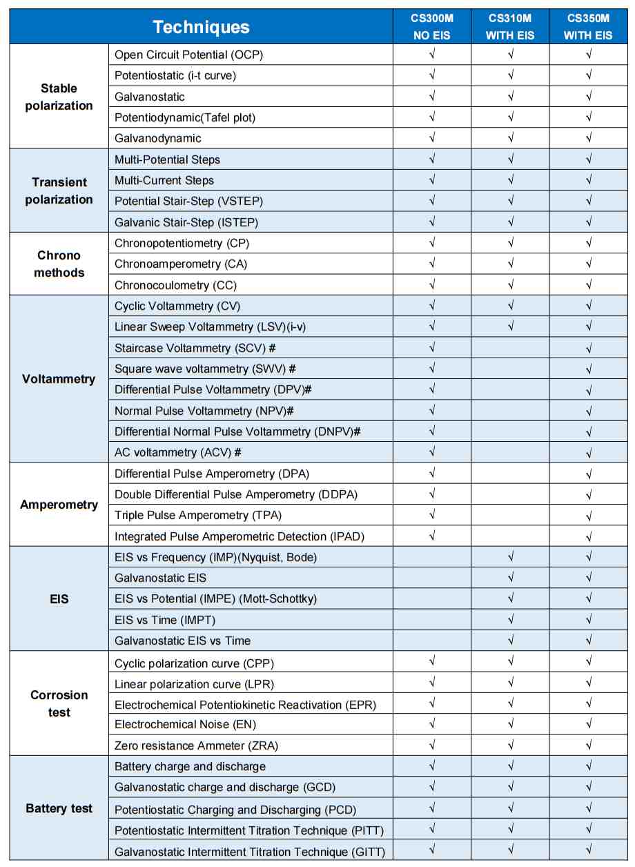 Equipped with EIS functionality, the CS310M supports essential electrochemical methods but offers fewer voltammetry techniques than the CS350M. It provides a cost-effective solution for users focused on corrosion analysis, battery testing, and similar applications.